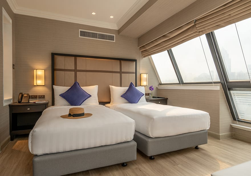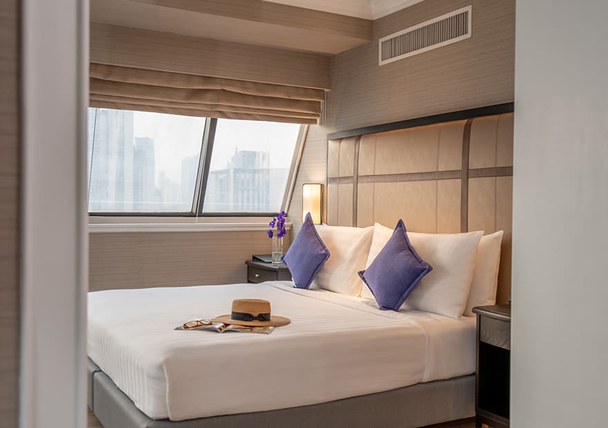 我们拥有307间客房和套房,分布在两栋楼内。 我们的高级客房位于暹罗大楼内,每间都设有私人阳台。 其余客房位于25层高的Krungthep大楼内,可欣赏到城市的壮丽景色,对于寻找曼谷素坤逸舒适酒店的客人来说,这里是完美的下榻之地。